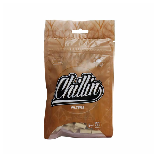 Filtro Chillin Biodegradavel, pacote contendo 150 filtros, medindo 6 mm cada, produzido sem agrotóxicos e com polpa de celulose natural não branqueada, ou seja, não contém cloro em sua composição.